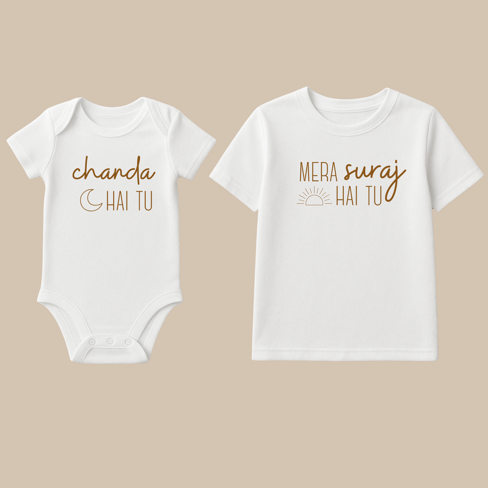 Celebrate your bond with our "Chanda Hai Tu, Mera Suraj Hai Tu" matching apparel set. Perfect parent-child, sibling, or couple outfits!